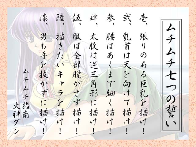 「ムチムチ7」とは「ムチムチ道」を極めんがため「七つの誓い」の下に 結成された「ムチムチ」専門同人結社です。 ※「ムチムチ」「七つの誓い」については下記をご覧ください。 [ムチムチとは] [ムチムチ七つの誓い]
